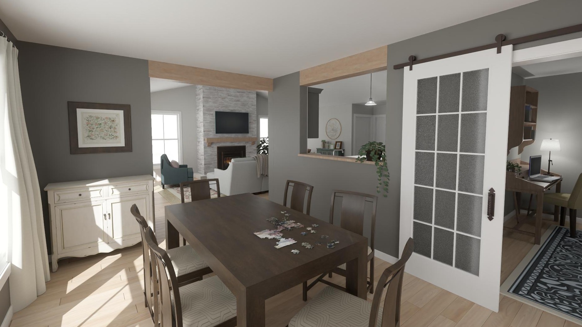 An enclosed hallway provides convenient access to both bathrooms for guests while maintaining privacy for the primary bedroom suite. The kitchen flows into a spacious living area, and a dedicated dining room - complete with a passthrough window to the kitchen - offers options for sit-down meals or everyday tasks like puzzles, crafts, homework, or working from home.