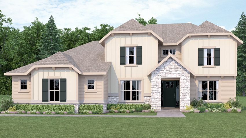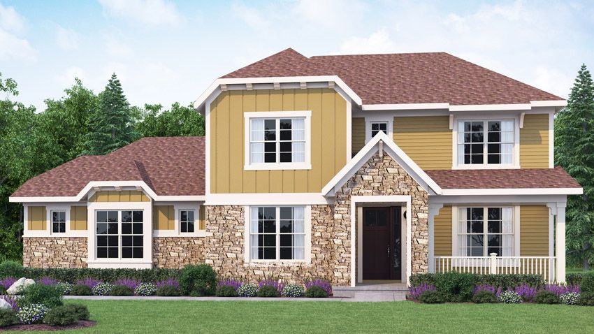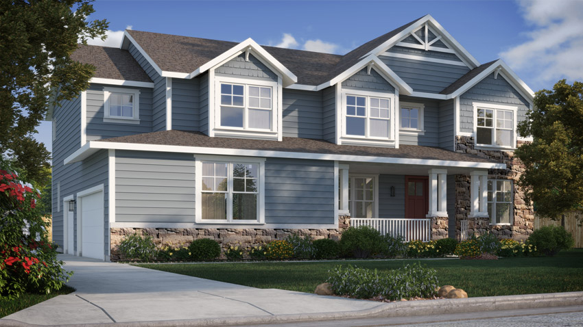 Exterior rendering of 1 story home floor plan, Bushwood, Craftsman style Craftsman