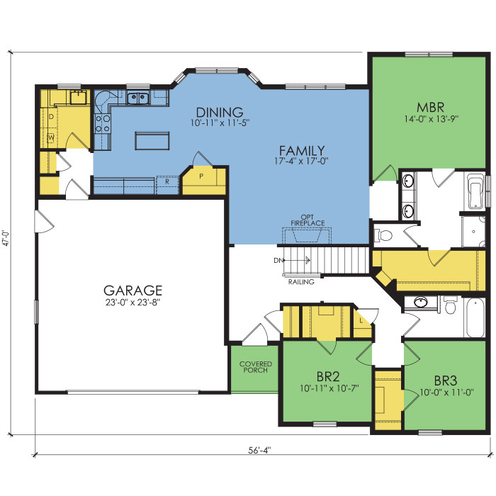 A part of our Wausau Originals, the Dodgeville floor plan features 3 bedrooms and 2 bathrooms with a foot print of 56'4"x47 feet and 1725 total square feet of living space. Floor Plan #WO400