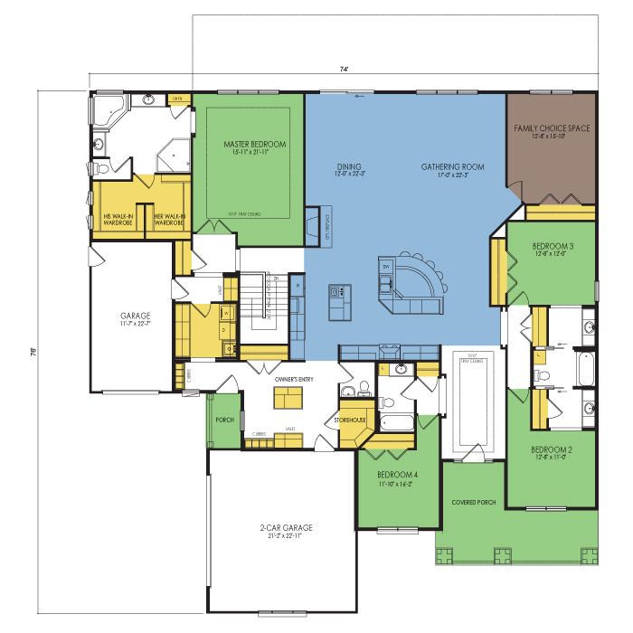 A part of our Architect series, the 1 story Milan floor plan features 4 bedrooms and 3.5 bathrooms with a footprint of 74x76 feet and 3709 total square feet of living space.