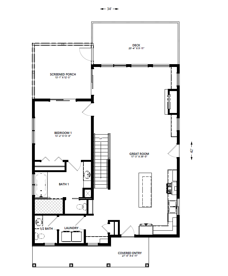 A part of our dream series, the tamarack floor plan features 3 bedrooms and 1.5 bathrooms with a foot print of 44x30 feet and 1342 total square feet of living space.