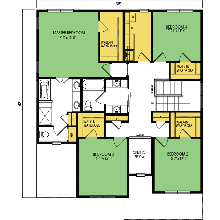 A part of our Family Series, the Wrangell floor plan features 4 bedrooms and 2.5 bathrooms, a 2 car garage, 2 stories, a footprint of 38x43 feet, and 2549 total square feet of living space. Floor Plan #FM267